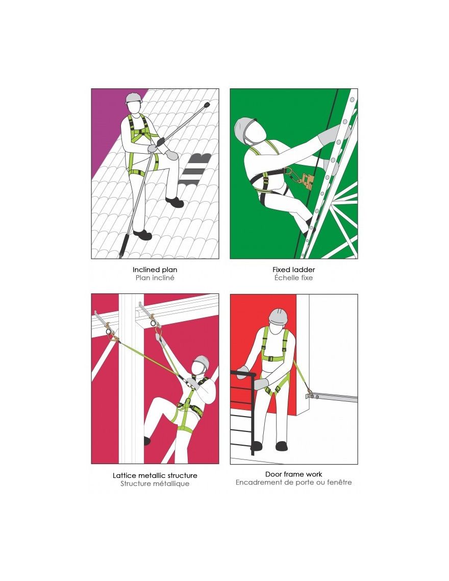Ce harnais est recommandé pour l'usage sur nacelles, sauvetage, espaces confinés, constructions, BTP, toitures, télécommunications, plates-formes, industrie.