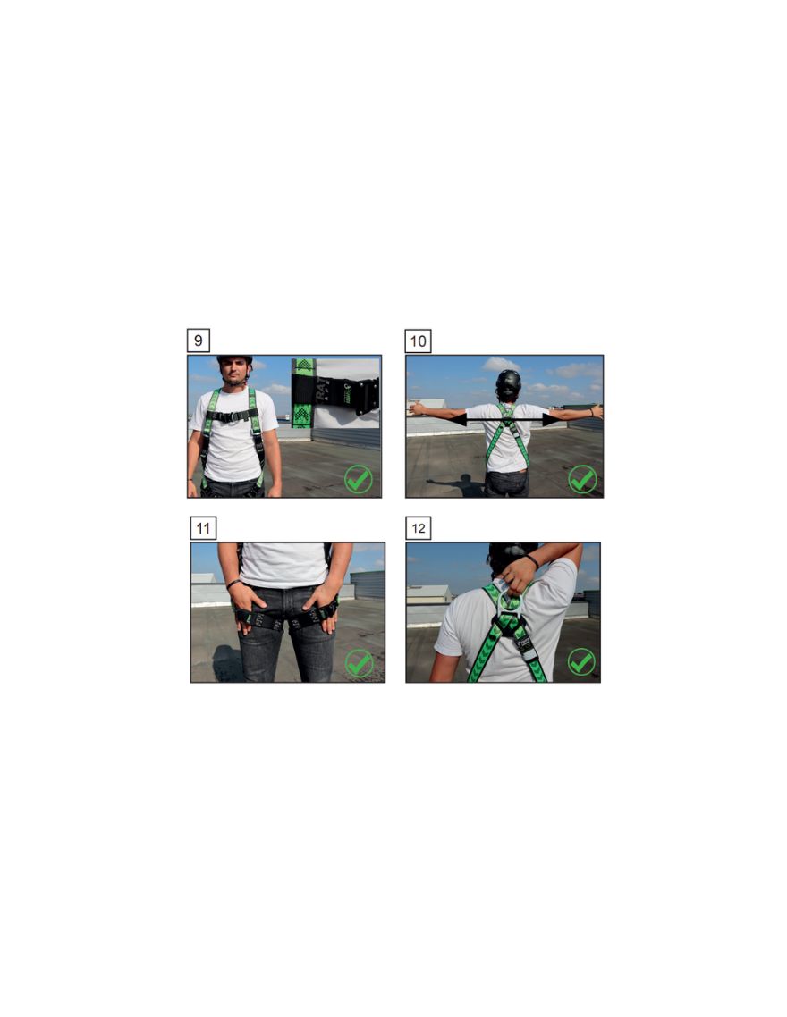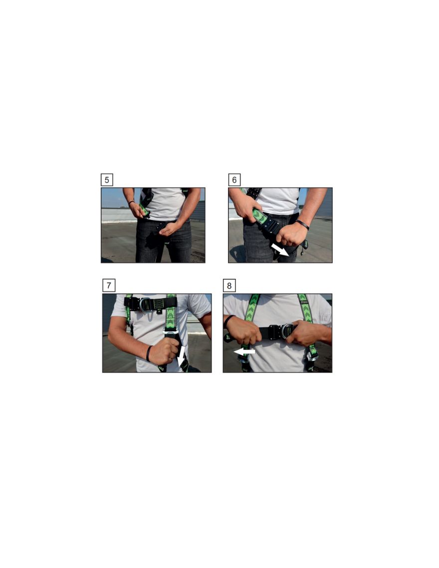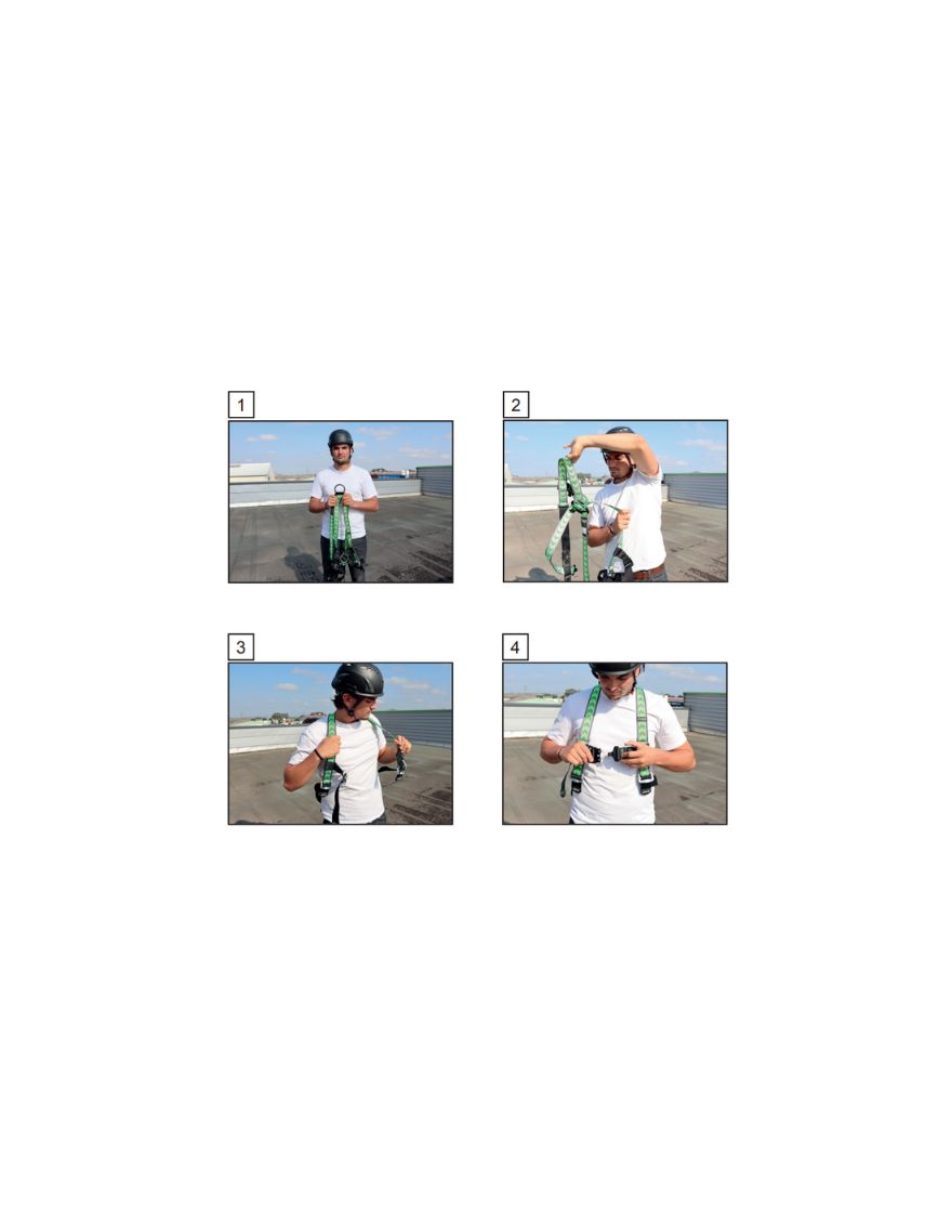 Un harnais est un équipement de protection individuelle, il doit être attribué à un utilisateur unique (il ne peut être utilisé que par une personne à la fois). Un harnais doit être au préalable ajusté à la taille de l’opérateur. Il faut régler, une fois pour toutes, les sangles de telle sorte que la sangle sous-fessière soit en place et que la plaque dorsale soit bien située entre les omoplates. Un harnais doit être sanglé au plus près du corps, sans excès, afin de laisser libres les mouvements de l’utilisateur. Respectez les étapes sur le schéma.