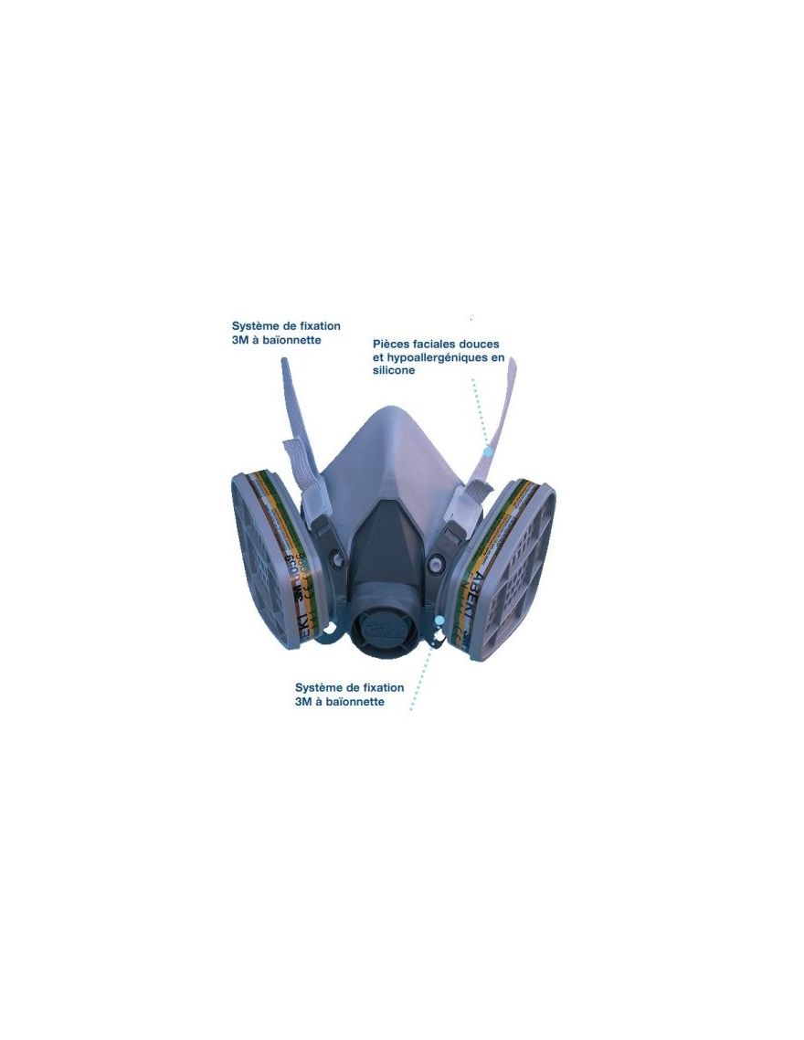 Demi-masque double filtres assurant un bon équilibre et une faible résistance respiratoire. Pièce faciale en élastomère, douce et légère. Équipé d'un système de fixation à baïonnette. Harnais + bride de fixation rapides à mettre en place.